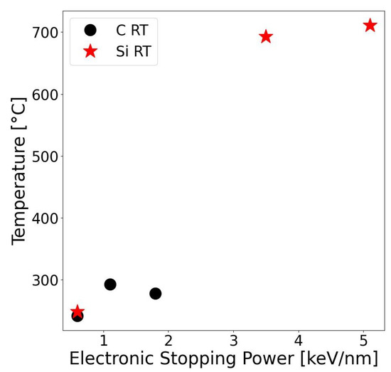RBS/C spectra of the Si and C-irradiated samples as a function of irradiation temperature and ion energy are shown in Figure 8. The backscattering yield changes with the irradiation temperature. At RT, damage is noticeable in each case, while at HT, measured damages are reduced. Following high-temperature irradiation of Si ions, the absence of discernible defects is observed.