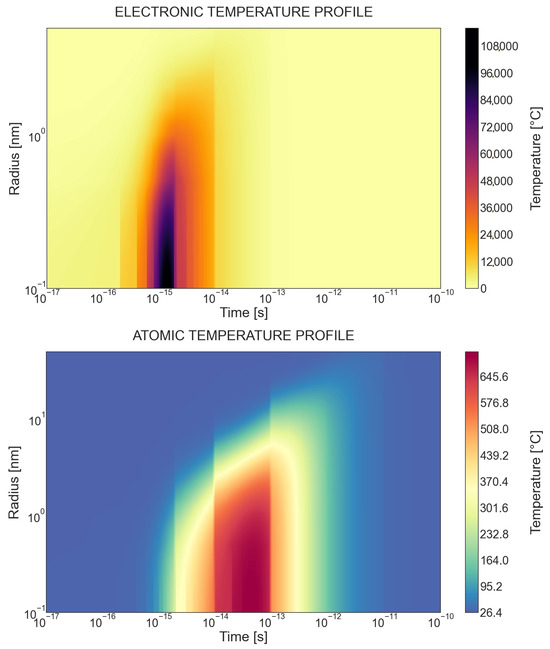 For the case of 21 MeV Si ion irradiation, temperature profiles in electronic and atomic subsystems as a function of time are presented in Figure 5. The rapid increase in temperature in the electron system can be observed from 0.001 ps to 0.01 ps after the passage of the ion. Energy is transferred to the atomic subsystems at a time from 0.01 ps to 0.1 ps. The temperature drops to an initial value of 10 ps after the passage of the ion. The subject of interest is what effect this increase in temperature in an extremely short time and space has on the formation of defects. Molecular dynamics simulations show that in the case of irradiation with lower energy ions (where ballistic collisions dominate), the maximum peak of defects occurs after a time ∼0.1 ps. Then, the number of defects stabilizes in the time range ∼1–10 ps [41,42,43]. Thus, the peak of defects may occur after the temperature drop from the maximum value. The energy from electrons rapidly dissipates away.