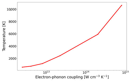 The maximum temperature in the center of the ion path as a function of electron–phonon coupling.