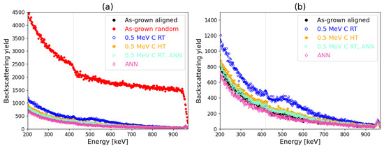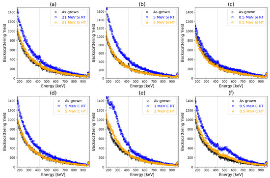Aligned spectra corresponding to the as-grown (pristine) and irradiated samples as well as a reference random spectrum are shown in Figure 7, Figure 8, Figure 9, Figure 10 and Figure 11 referring to the implantation using C and Si ions. Figure 7 shows the spectra recorded for the pristine and as-implanted samples and the results of the thermal annealing applied after or during the corresponding irradiation. The random spectrum is shown only in Figure 7a, while it was omitted for the sake of clarity in Figure 7b as well as Figure 8, Figure 9, Figure 10 and Figure 11. Figure 8 shows the effects of irradiation temperature on the formation of defects. Figure 8a–c show the results for Si irradiation, while Figure 8d–f present results for C irradiation.