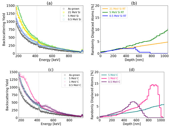 RBS/C spectra recorded for the 3C-SiC samples before and after irradiation using Si and C ions are shown in Figure 9a,c, respectively. Corresponding depth distributions of RDAs calculated by the McChasy-1 code are shown in Figure 9b,d. The damage profiles show evidence of existing defects that are in good agreement with the dpa profiles predicted by SRIM. The backscattering yield of the aligned spectra increase with the fluence of Si ions (Figure 9a). In the case of C irradiation, damage peaks are formed for energies of 0.5 MeV and 1 MeV, corresponding to the depths 550 nm and 900 nm. They are a consequence of stopping C ions at very low energies for which the nuclear stopping power is significant.