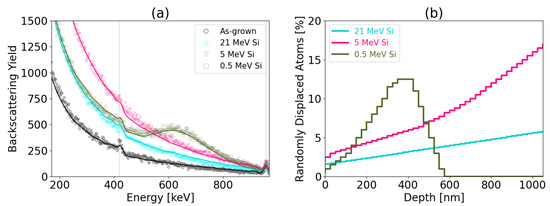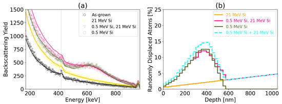 Results of irradiation performed with Si ions (0.05 dpa at the depth of 500 nm). (a), RBS/C spectra (discrete plots) and spectra simulated by McChasy code (solid lines) are shown. The corresponding randomly displaced atoms determined by the McChasy simulations are (b).