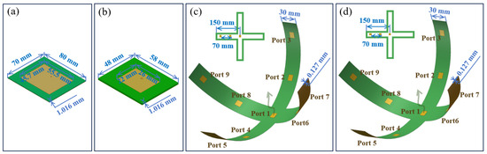 Since the dimensions of an elementary patch antenna at 2 GHz and 4 GHz are too large to form a flexible patch array with high performance, only a single patch radiator is used to feed the Luneburg lens at 2 GHz and 4 GHz. The size of the patch antenna is 45.7 mm × 55.5 mm and 22 mm × 26 mm, respectively, at 2 GHz and 4 GHz, as shown in Figure 3a,b. At 6 GHz and 8 GHz, the flexible multiport patch antenna has a cross-shaped centrosymmetric structure. For the frequency of 6 GHz, each radiating patch element has a size of 15 mm × 15 mm and the spacing between two patches is 70 mm. For 8 GHz, each radiating patch element has a size of 11.3 mm × 11.3 mm with a spacing between two patches of 70 mm. A F4B dielectric substrate of relative permittivity 2.65 and thickness 0.127 mm is used for the two flexible antennas. The thin substrate chosen for the high curvature bending enables the antenna to be tightly conformed to the spherical surface of the lens.