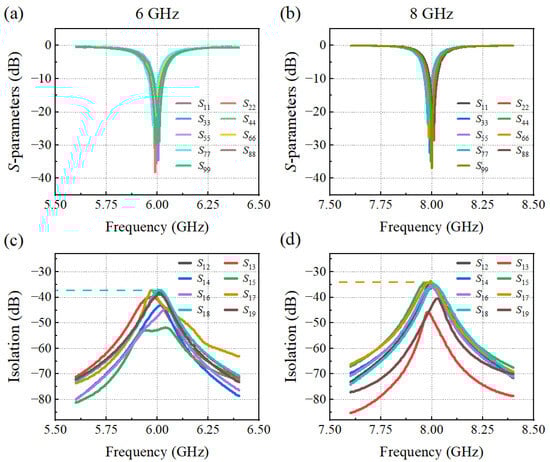 Matching responses (Sxx-parameters) of the multiport patch antenna array operating at (a) 6 GHz, and (b) 8 GHz. Measured isolation between port 1 and the other ports at (c) 6 GHz, and (d) 8 GHz.