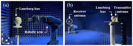 Both the near-field and far-field experimental measurements of the Luneburg lens are performed in an anechoic chamber. For the near-field measurement, the setup is composed of the robotic arm with a field-sensing probe, as displayed in Figure 6a. The robotic arm can move in one plane with a step of 3 mm. Both the feed antenna and probe are connected to the vector network analyzer. For the far-field measurement setup, shown in Figure 6b, a horn antenna is used as receiver and is placed almost 6 m far from the Luneburg lens to collect the electric-field data in the far-field zone. The flexible antenna and the Luneburg lens are placed on a rotating plate and the far-field system is able to measure the radiation patterns for azimuthal angles in the ±90° range.
