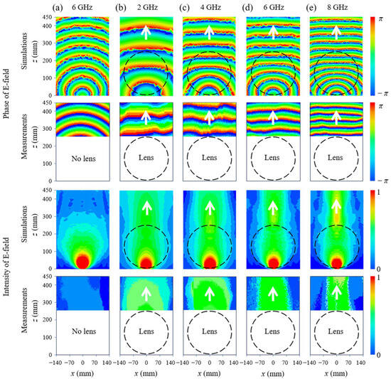 To verify the broadband property of the 3D printed Luneburg lens-antenna, full-wave simulations and near-field measurements are performed from 2 GHz to 8 GHz. Both the intensity of the electric field and wavefront of the generated beam are displayed for the near-field results, as shown in Figure 7. The size of scanning area for the experimental measurements is 280 mm × 200 mm while the size of the simulated area is 280 mm × 450 mm. The near-field results of the patch antenna alone at 6 GHz used as a reference is presented in Figure 7a, where a spherical wave propagating along the z-axis with a curved wavefront can be clearly observed. The near-field results of the Luneburg lens-antenna are depicted in Figure 7b–e at 2 GHz, 4 GHz, 6 GHz, and 8 GHz, respectively, where the transformation from spherical waves to the plane waves is realized. A higher energy level of the plane wave can also be observed when compared to the spherical wave of the feed antenna at the same position. The good agreement between the simulations and measurements confirms the good implementation of the metamaterial unit cells to realize the required permittivity distribution of the Luneburg lens over a broad frequency range.