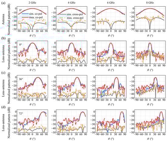 Then, far-field simulations and measurements are carried out at 2 GHz, 4 GHz, 6 GHz and 8 GHz with port 1 excited for boresight radiation. The far-field patterns of the feed antenna alone are shown in Figure 9a, where a wide beam, typical characteristic of a microstrip patch antenna, is observed. Conversely, a narrower beam is obtained with the lens-antenna system, as shown in Figure 9b, indicating a good wavefront transformation of the designed Luneburg lens. The beam demonstrates a high degree of directivity, indicating the capacity of the lens-antenna to generate a directional and high-energy beam, which is favorable for long-distance transmissions. Moreover, as frequency increases, the directivity of the radiated beam increases due to the size of the lens, which becomes bigger when compared to wavelength, and the gain of the lens-antenna system is measured to be between 15.3 dBi to 22 dBi for the frequency varying from 2 GHz to 8 GHz. The half power beam width (HPBW) extracted from the experimental data shown in Figure 9b for boresight (0°) radiation is found to be 29.6° at 2 GHz, 19.2° at 4 GHz, 15.2° at 6 GHz, and 12° at 8 GHz. Meanwhile, when the beams are emitted at 36° and 72° separately, as depicted in Figure 9c,d, the same good beam convergence, highlighted by side lobes level lower than −10 dB, can be observed as for boresight (0°) radiation. Furthermore, the cross-polarization level is found to be lower than −15 dB in all cases, indicating a high polarization purity.