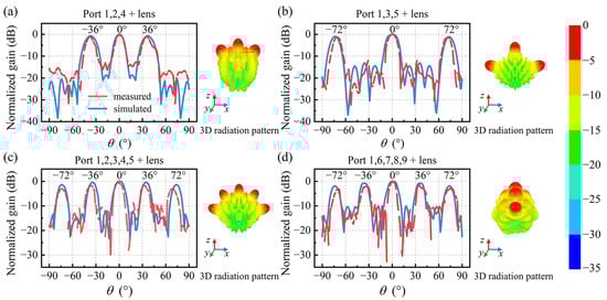 In order to validate the multi-beam feature of the Luneburg lens-antenna, far-field measurements of the Luneburg lens are performed at 6 GHz with multiple ports of antenna excited simultaneously. According to the geometric structure of the flexible antenna, the three beams are expected to be generated at 0° and ±36° when ports 1, 2, and 4 are simultaneously excited. When ports 1, 3, and 5 are simultaneously excited, the three beams are expected to be generated at 0° and ±72°. As it can be observed in Figure 10a,b, the simulated and measured radiation patterns are consistent with the expectations.