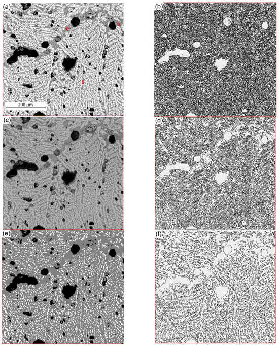 Figure 1a shows significant noise in each of the three phases. The interface shown in Figure 1b demonstrates the intensity of the noise. For example, the residual phase labelled by arrows in Figure 1a is hardly recognisable in Figure 1b due to the greyscale value fluctuation. Although the phases in Figure 1a are recognisable by the naked eye, it is difficult for a computer to recognise the pattern and perform statistical calculations of the microstructural characteristics without numerical treatment. For this purpose, Equation (3) with and the kernel format in Equation (5) were implemented to recalculate the greyscale values in each pixel in Figure 1a. The result is shown in Figure 1c and the corresponding interface is shown in Figure 1d. The grain morphology in Figure 1c is much smoother than that in Figure 1c, and all three phases are recognisable in Figure 1d. Figure 1e,f shows the results with . It can be seen that the image is over-smoothed, and the fractions of dendrite and residual phases are clearly changed by the smoothening calculation. More different smoothing lengths with and were tested. gives the best result.