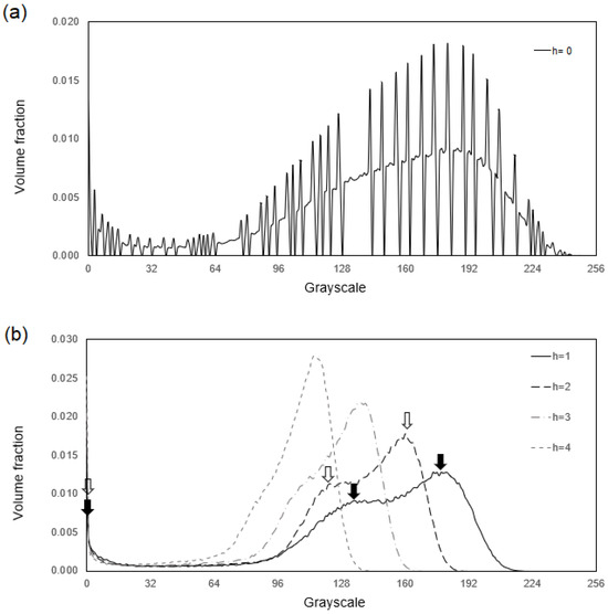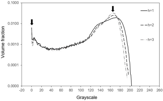 Figure 2 shows the volume fraction of the pixels and the greyscale value relationship. Figure 2a was obtained from the original image of Figure 1a, and Figure 2b is for those processed images in Figure 1c,e and the other unpresented ones. Instead of the expected three peaks corresponding to the three phases and the area under each peak equalling the corresponding phase’s volume fraction, Figure 2a contains not only high-amplitude noise but only two peaks instead of three. Figure 2b shows that the noise in the smoothed image has been effectively suppressed for all calculations. In the calculations with and , some missing peaks caused by noise reappear, as indicated by the arrows. In contrast, excess smoothing lengths with smears out some peaks again and moves the peaks toward the average greyscale value in the image, which should be avoided.