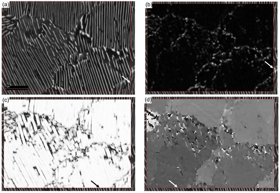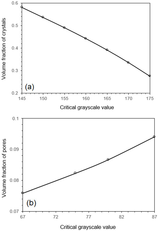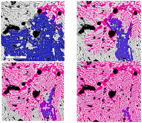 The importance of the accurate implementation of the volume fraction of phases to determine the critical greyscale values is demonstrated in Figure 4, where the critical greyscale value between pores and the residual phase is set to 67, while that between the residual phase and primary dendrites is set to (a) 150, (b) 155, (c) 160, and (d) 165. Two grains are highlighted: one at the residual phase in pink (around the top-right) and another dendrite grain in blue (around the bottom-right). Both have significantly different sizes from Figure 4a–d. This imposes an important impact on the prediction of the mechanical and physical properties of materials [25]. For example, the crystal phase has better heat conductivity than the other phases [26], where a large-scale crystal skeleton forms a percolation path to conduct heat, while the intersected dendrite by the residual phase is unable to do so.
