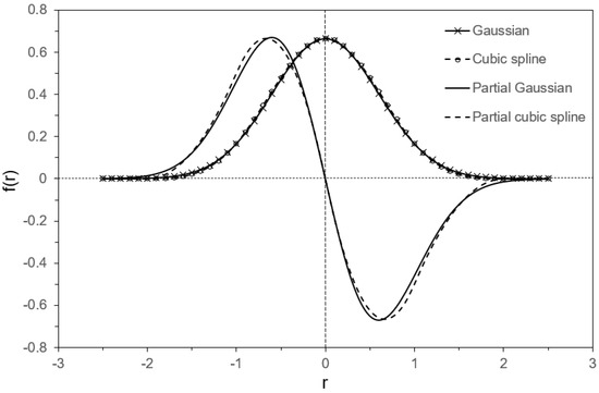 where is one of the coordinate axes. There are several formats available for the weight function. The most commonly used format is the cubic spline kernel [19,20], which is based on Schoenberg’s piece-wise continuous functions [21]. This kernel gives a weight function for the contribution of a quantity at the radial direction with a distance as follows: