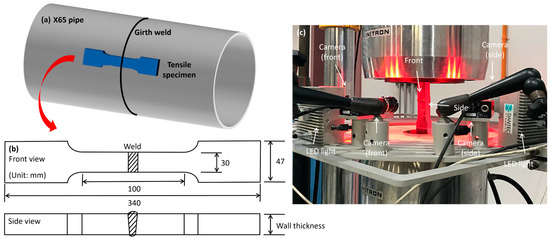The specimens, sectioned from a girth welded X65 pipeline, were manufactured for the cross-weld tensile tests in accordance with the AS 2205.2 testing standards [26]. As shown in Figure 1a, the specimens were cut from the girth-welded pipes with the weld bead positioned at the center. The reduced section, as depicted in Figure 1b, measures 100 mm in length and 30 mm in width, with the sample thickness matching that of the pipe wall. To accurately assess the impact of reinforcement on tensile failure, additional samples were prepared by removing the weld cap and root from the standard tensile specimens, thus producing samples without reinforcement.