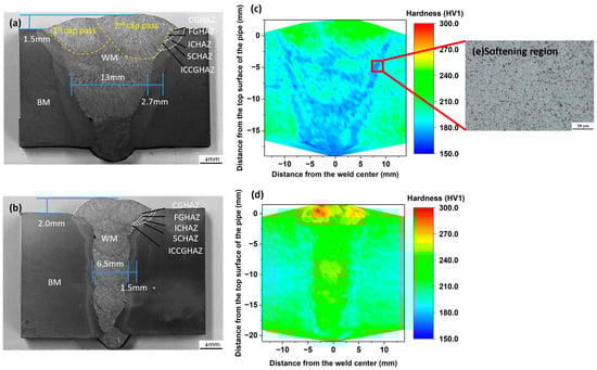 Geometry and morphology of cross-weld sections of (a) SMAW-ed P1 and (b) GMAW-ed P2; Hardness mapping of (c) P1 and (d) P2 girth weld; (e) Microstructure of the softening region.