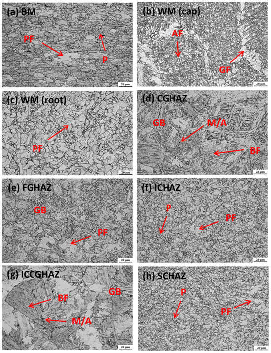 Figure 3 and Figure 4 show the detailed heterogeneous microstructures of BM, WM and HAZ. As evidenced by Figure 3a and Figure 4a, there is no notable microstructural difference between the base metal of samples P1 and P2, which are primarily composed of polygonal ferrite (PF) and islands of pearlite (P). This similarity in microstructure corresponds to the nearly identical chemical compositions of the two samples, as presented in Table 1.