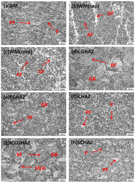 The microstructures of HAZ subregions of the P1 and P2 specimens are displayed in Figure 3d–h and Figure 4d–h. The CGHAZs of both samples mainly consist of bainitic ferrite (BF) and granular bainite (GB), as shown in Figure 3d and Figure 4d. However, there are morphological differences in the CGHAZs of P1 and P2. As shown in Table 2, the weld joint of the SMAW-ed P1 sample experiences higher heat input, resulting in a coarsening of ferrite and an increased proportion of granular bainite. Meanwhile, a small amount of martensite-austenite (M/A) components can be observed in the CGHAZ of P1 in Figure 3d. For the GMAW-ed P2 sample, the bainite is distributed as fine laths, with visible original austenite grains. The FGHAZ in Figure 3e and Figure 4e is mostly composed of polygonal ferrite and granular bainite. P2 exhibits a finer microstructure than P1 due to lower heat input. The ICHAZ and SCHAZ of both specimens are similar to the base metal, consisting of polygonal ferrite and a small amount of pearlite, as shown in Figure 3f,g and Figure 4f,g. The ICCGHAZ in Figure 3h and Figure 4h has a microstructure similar to the CGHAZ, consisting mainly of bainitic ferrite, granular bainite, and M/A. However, more M/A are precipitated at the grain boundary, which greatly reduces toughness and increases the risk of brittle fracture [36,37].