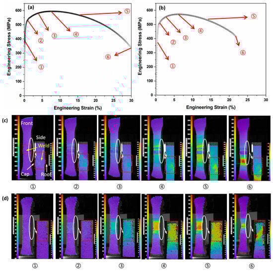 Figure 5c,d illustrate the evolution of strain distribution and migration of maximum strain among inhomogeneous materials of base metal, weld, and HAZ as deformation increases in the girth weld with and without reinforcement. For clarity, six typical stages of strain distribution at different levels of deformation are shown, corresponding to (1) elastic deformation, (2) onset of yield point, (3) development of plastic deformation, (4) deformation at ultimate tensile strength, (5) necking, and (6) fracture, as labeled in Figure 5a,b. The front DIC image in Figure 5c,d captures the full deformation of the entire reduced section, as recorded by two front-facing cameras. The side DIC image in Figure 5c zooms in on the enlarged weld (including the cap, fill, and root), HAZ and base metal, as captured by two side cameras. The red dashed rectangles in the figures indicate the weld regions themselves.