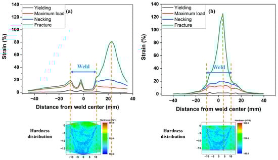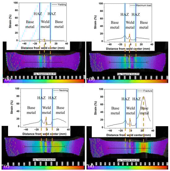 The detailed DIC analysis of the front view provides insights into the maximum strain migration process from a macro perspective. Figure 6 illustrates the strain distribution along the central line of the SMAW-ed P1 sample with reinforcement at different stages. From yielding to the maximum load, as depicted in Figure 6a,b, strain concentration is observed at geometrically singular points, specifically the intersections of two weld passes, and in the HAZ characterized by lower hardness, while other areas exhibit smaller deformations. The highest strain is initially 4% at the onset of yielding and increases to 15% at the stage of maximum load (UTS point). Additionally, there is no migration of strain observed prior to reaching the maximum load. In Figure 6c, the strain concentration shifts to the base metal adjacent to the right HAZ, reaching a peak strain of 20%. This shift in strain concentration from previously higher-strain areas, such as the HAZ, to the base metal is referred to as maximum strain migration. Subsequently, as depicted in Figure 6d, the strain in the base metal adjacent to the right HAZ sharply increases to nearly 80%, leading to the fracture of the sample.