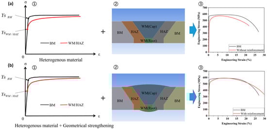 Mechanism of strain migration of undermatched girth welds. (a) without reinforcement and (b) with reinforcement, displaying (①) illustration of heterogeneous materials of BM, WM and HAZ; (②) illustration of reinforcement-induced geometry strengthening; (③) resultant actual cross-weld tensile deformation of SMAW-ed P1 sample.