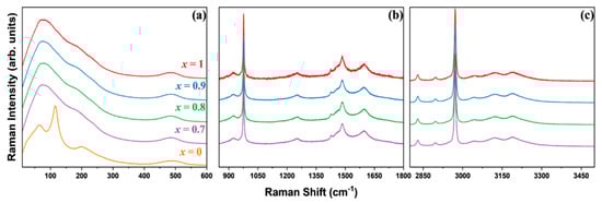 Figure 2 shows the Raman spectra of the MAxCs1−xPbCl3 single crystals at room temperature, with x values ranging from 0 to 1. The spectrum was recorded over a broad frequency range spanning from 10 to 3500 cm−1 and is divided into low, intermediate, and high wavenumber regions. The vibrational modes observed in MAxCs1−xPbCl3 (x = 1, 0.9, 0.8, 0.7) extend up to 3500 cm−1. The high-frequency modes are primarily attributed to the internal vibrations of the MA units. In contrast, high-frequency vibrational modes are absent in CsPbCl3 due to the presence of heavy Pb2+ and Cs+ ions, together with the absence of any internal vibrational modes associated with the inorganic Cs+ cation. Figure S5 in the Supplementary Materials depicts the room temperature Raman spectra of the MACl and PbCl2 powders to identify the peaks from the MA and lead chloride system. The spectra of these powders indicate different bonding characteristics compared to those of the synthesized mixed single crystals. In the single crystals, the interactions between MA and the lead octahedra resulted in a shift of several peak positions, reflecting the strong interactions and bonding in the three-dimensional lattice structure.