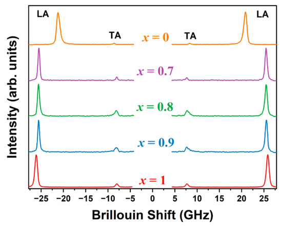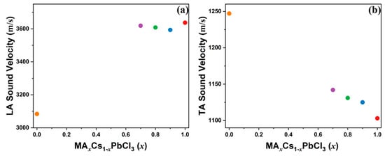 where λ represents the excitation wavelength (532 nm), and n represents the refractive index of the crystal. However, the experimental refractive indices for MAxCs1−xPbCl3 (x = 0.9, 0.8, 0.7) have not been reported. Therefore, we derived approximate refractive indices via linear interpolation between the experimental values of MAPbCl3 (n = 1.90) single crystals [53] and CsPbCl3 (n = 1.81) thin films [54], as shown in Figure S11 in the Supplementary Materials. Using the refractive index data, we determined the sound velocities of the LA and TA modes, which are shown in Figure 4. The sound velocity of the LA mode exhibited a slight decrease followed by a gradual increase as the Cs content increased to x = 0.7. However, all values of MAxCs1−xPbCl3 were significantly higher than the value for x = 0. The longitudinal sound velocity decreased from 3637 m/s to 3084 m/s, approximately a 15% reduction, as the composition changed from x = 1 to x = 0. One possible reason for this difference could be the measurement temperature for CsPbCl3, which was higher than RT since its phase is not cubic at RT. The sound velocity of the TA mode exhibited a monotonic increase with increasing Cs content across the investigated composition range. The transverse sound velocity increased from 1103 m/s to 1247 m/s, representing an approximate 12% increase as the composition changed from x = 1 to x = 0.
