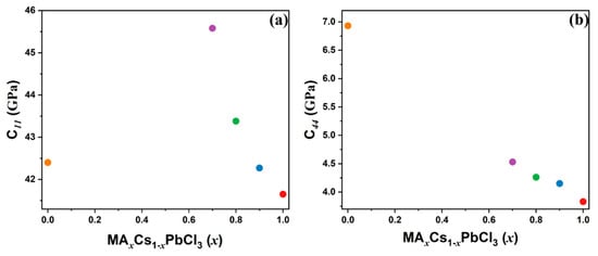 (a) C11 and (b) C44 elastic constants as a function of composition in MAxCs1−xPbCl3 (x = 1, 0.9, 0.8, 0.7, 0) single crystals (color online).