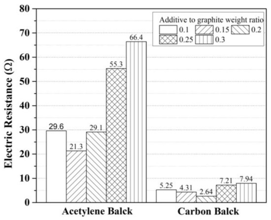 | Mixture | Graphite | Acetylene Black | Carbon Black | Inorganic Binder | Water | Electric Resistance (Ω) |