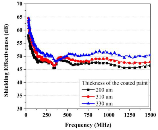 - The adhesion strength and moisture resistance evaluation of the EMP shielding paint were evaluated. The average adhesive strength of the EMP shielding paint was 1.26 MPa. As a result of a moisture resistance test left at a temperature of 50 ± 3 °C and a relative humidity of 95% or higher for more than 120 h, no cracks or peeling were observed on the painted surface.