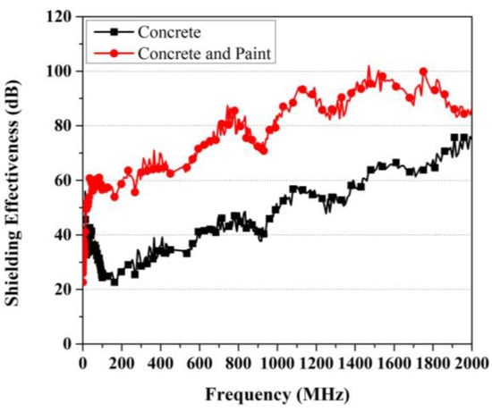 - To verify the shielding effectiveness improvement effect of EMP shielding paint for building interiors, it was applied to shielding concrete. As a result, the application of EMP shielding inorganic paint improved the shielding effectiveness by approximately 25 dB and up to 43 dB.