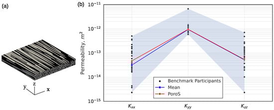 To prove that the body force-driven flow condition is valid, PoroS was first validated with various standard flow and permeability problems from the literature, such as Poiseuille flow in a pipe and 2D flow in channels with square and rectangular obstacles. Then, a detailed comparison was made with respect to the results of the international numerical permeability benchmark on fibrous media, thereby validating both the solver and the novel approach. This challenging test case has a total of about 120 million voxels, resulting in a total of about 3 billion DoFs. By comparing results from other software, it is shown that in domains with a strong influence of boundary conditions, the body force-driven flow leads to more accurate predictions. The method of computing the complete tensor by homogenisation, combined with the ability to process the complete geometry, leads to more accurate results than approaches that require the geometry to be subdivided or that do not identify the full tensor. Finally, the importance of predicting the full permeability tensor was also demonstrated, especially in the case of heterogeneous and anisotropic porous microstructures, where the dominant flow direction might be different from the dominant material structure orientation.