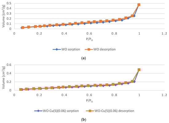 The N2 adsorption–desorption isotherms acquired for the unmodified WO sample and WO-Cu(SpT) (MBC) WO-Cu materials are presented in Figure 8. As it may be observed, the adsorption branch of the isotherm resembles the type II isotherm, which is S-shaped/sigmoid-shaped, according to the International Union of Pure and Applied Chemistry (IUPAC) classification [177,178,179]. This type of isotherms occurs in the case of the physisorption of gases on non- or mesoporous adsorbents and is associated with the monolayer formation followed by the multilayer adsorption [177,178,179]. Since for all of the samples, the observed point B, i.e., the so-called “knee” defined as the beginning of the middle almost linear section, is not so distinctive (a more gradual curvature occurs), it may be concluded that the monolayer formation is overlapped by the multilayer adsorption [178]. It may be observed that with increasing relative pressure, the multilayer adsorption takes place, resulting in an increasing isotherm slope [177]. For all samples, the appearance of the H3 hysteresis loop was observed. The occurrence of the hysteresis loop is a result of the capillary condensation associated with the presence of mesopores [178,179], and the H3 hysteresis loop is related to the slit-shaped pores [178,180].