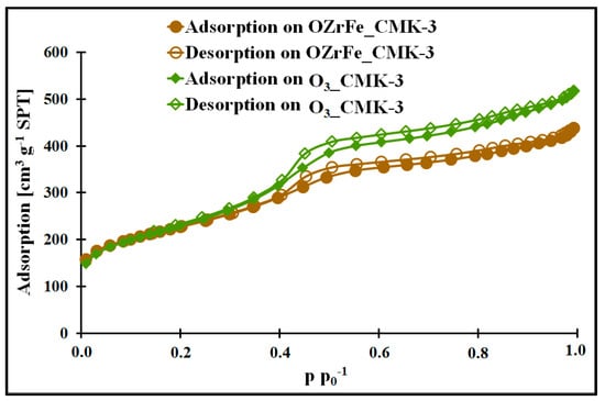 In Figure 2 and [11], the nitrogen adsorption/desorption isotherms for all studied mesoporous carbons are depicted. They are classified as Iva type according to the IUPAC [15]. Each isotherm possesses the hysteresis loop of the H1 type at 0.4 p p0−1. The presence of the hysteresis loop shows the presence of the mesoporous structure with homogenous, narrow, and slit-shaped mesopores. Additionally, the isotherm begins from the high nitrogen adsorption values for all studied carbons, which indicate the strongly developed surface in each case. The mesopores’ presence is confirmed by the BJH pore size distributions of the I_CMK-3 [11], O3_CMK-3, and OZrFe_CMK-3 carbons (Figure 2), for which the pore diameters are in the range of 3.1–3.8 nm (mesopore region). The BJH pore size distributions for the studied carbons also reveal the microporous structure, which can be related to the carbon rod connectors [16].