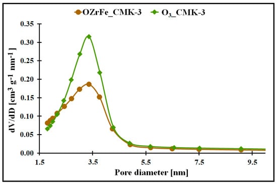 The micro-mesoporous structure of the studied mesoporous carbons is confirmed by the porous data obtained from the nitrogen adsorption/desorption isotherms (Table 1, Figure 3). All studied carbons have a high specific surface area (>600 m2 g−1), which can be related to the presence of micropores in their structure. In contrast, the high total pore volume values (>0.6 cm3 g−1) are possible due to the mesopores’ presence in the structure of CMK-3, O3_CMK-3, and OZrFe_CMK-3 carbonaceous materials. The ozone-oxidation of the pristine CMK-3 carbon is responsible for the substantial increase in the SBET value (from 663 m2 g−1 to 815 m2 g−1) and slight increase in the VT value (from 0.73 cm3 g−1 to 0.80 cm3 g−1) of the resulted material. This oxidation process also changed the mesopore diameter from 3.1 nm to 3.4 nm. It proves that carbon ozonation is an effective process for the microporosity development in the carbonaceous structure, and the formed surface functionalities are probably responsible for the mesopore expansion. The further chemical modification of the O3_CMK-3 carbon by the Zr and Fe compounds resulted in a small decrease in the SBET (from 815 m2 g−1 to 798 m2 g−1), an observable decrease in VT (from 0.80 cm3 g−1 to 0.68 cm3 g−1) and no change in the mesopore diameter. These data suggest the introduction of the Zr and Fe compounds inside the mesopores rather than micropores, which decrease the diameter of the mesopores obtained from the mesoporous carbon.