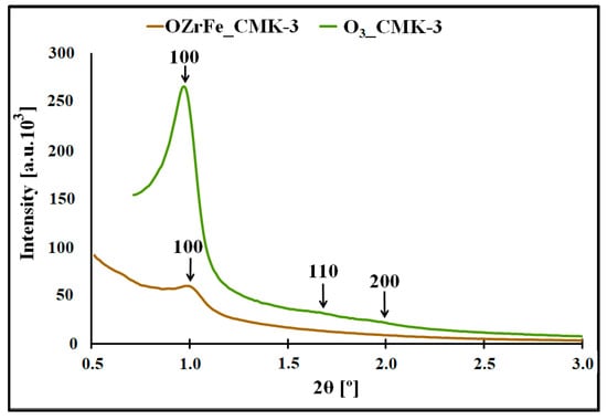 In Figure 4, the XRD diffractograms for the O3_CMK-3 and OZrFe_CMK-3 carbons are presented. In the case of the ozone-oxidized carbon, the three reflections are observed for 2Θ angles 1.0°, 1.7°, and 1.9°, which are related to the hexagonal p6mm symmetry of the mesoporous structure, like those for the pristine I_CMK-3 carbon [11]. Another situation is observed for the OZrFe_CMK-3 carbon, for which only one reflection was recorded for 2Θ angle 1.0°. It means that the ozone-oxidation of the I_CMK-3 carbon does not influence the mesopores’ order degree, in contrast to the Zr and Fe modification of the oxidized carbon material. In the latter case, the order degree of the mesopores severely decreased, which is probably connected with the incorporation of Zr and Fe compounds inside the mesopores of the OZrFe_CMK-3 carbonaceous material.