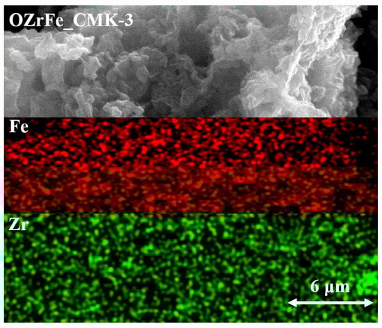 Additionally, the results from the SEM mapping of Zr and Fe for OZrFe_CMK-3 have been presented in Figure 6. These two metals are homogenously dispersed on the surface of the OZrFe_CMK-3 carbonaceous material. Also, Zr and Fe are placed in the same places, which can be related to the formation of the mixed Zr-Fe compound on the carbonaceous surface during its chemical modification [17].