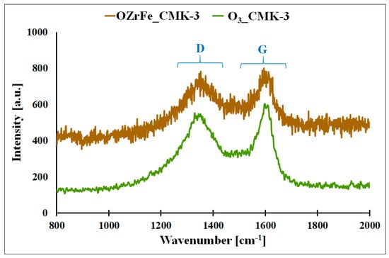 In Figure 7, the Raman spectra of the synthesized carbonaceous materials are presented. On these spectra, two bands are observed: D, located at 1317 cm−1,, and G, located at 1581 cm−1. The D band corresponds to the defects in the carbonaceous material’s graphene domains, and the G band is related to the graphene domains without defects, like those in the pure graphene [11]. The shape of the Raman spectra for O3_CMK-3 and OZrFe_CMK-3 is similar to the shape of the Raman spectrum for the pristine I_CMK-3 carbon, which is related to the amorphous structure of the carbon rods of these materials [11]. Additionally, the intensity ratio of D and G bands (ID IG−1) practically did not change after the modification of the pristine and ozonized carbonaceous materials (I_CMK-3: 0.90, O3_CMK-3: 0.88, OZrFe_CMK-3: 0.89). This means that oxygen and Zr/Fe functionalities were not incorporated into the inner structure of the graphene layers but rather on their edges.