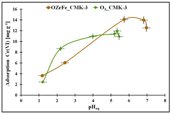 The changes in the Cr(VI) adsorption onto the studied carbons in the function of the pHeq are illustrated in Figure 8. In the case of the ozonized carbon, the pHeq change from 1.0 to 5.3 is related to the Cr(VI) adsorption increase from 2.5 mg g−1 to the maximum value in the studied conditions (ca. 12 mg g−1). The further increase in the Cr(VI) aqueous solution pH in this adsorption system induced a slight decrease in the Cr(VI) adsorption (up to 11 mg g−1). For OZrFe_CMK-3, the Cr(VI) adsorption increase (from 3.8 mg g−1 to 14 mg g−1) is observed in the pHeq range from 1.0 to 5.8 and then is constant up to 6.7. Above pHeq = 6.7, the Cr(VI) adsorption decreased to 12.5 mg g−1 in the studied adsorption system. Thus, the optimal pH of the aqueous Cr(VI) solution is 5.3 for the O3_CMK-3 carbon and 5.8–6.7 for the OZrFe_CMK-3 carbon.
