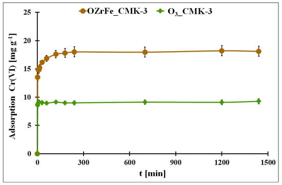 The Cr(VI) adsorption in the function of the contact time for the studied carbonaceous materials (m = 20 mg, V = 5 mL, pHeq_O3_CMK-3 = 5.3, pHeq_OZrFe_CMK-3 = 5.8, C0Cr(VI)_O3_CMK-3 = 58 mg L−1, C0Cr(VI)_OZrFe_CMK-3 = 74 mg L−1).
