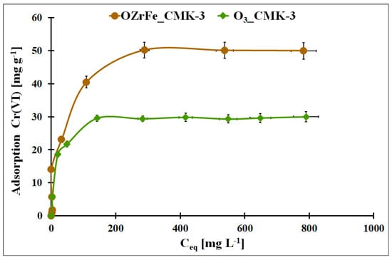 The Cr(VI) adsorption isotherms for studied carbonaceous materials (m = 20 mg, V = 5 mL, pHeq_O3_CMK-3 = 5.3, pHeq_OZrFe_CMK-3 = 5.8, teq = 24 h, T = 25 ± 4 °C).