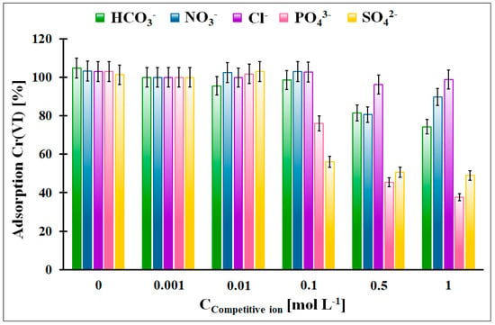 The influence of the competitive anions, which can be present in the galvanic wastewater, on the Cr(VI) adsorption onto the OZrFe_CMK-3 carbon was illustrated in Figure 11. According to the obtained data, the Cl−, NO3−, and HCO3− anions did not influence the Cr(VI) adsorption in the studied adsorption system. The highest impact was observed in the case of the SO42− anions (the 50% decrease in the Cr(VI) adsorption from 100 mmol L−1) and PO43− anions (the 60% decrease in the Cr(VI) adsorption from 500 mmol L−1). The influence of the SO42− can be explained by the complexation of the Zr(IV) ions on the carbonaceous surface and the strong impact of PO43−, which can probably be related to the surface precipitation of the FePO4. The formed layer of the adsorbed anions onto the carbonaceous surface can electrostatically repulse the Cr(VI) ions, which resulted in the lower Cr(VI) adsorption onto the studied material.
