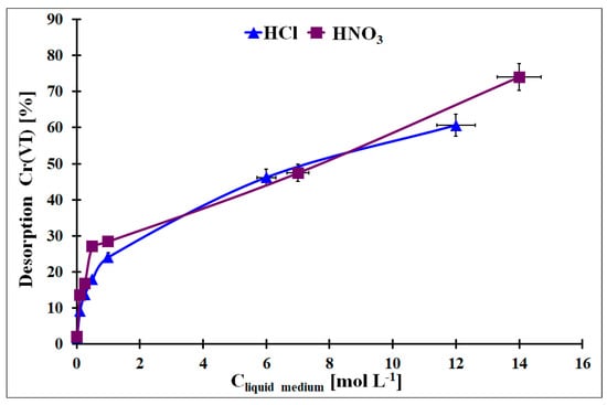 The desorption of the adsorbed Cr from the OZrFe_CMK-3 surface by the HCl and HNO3 with various concentrations (mCr-loaded carbon = 5 mg, Vliquid medium = 2 mL, tdes. = 24 h, A = 38.3 mg g−1).