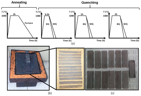 (a) Schematic diagram of the annealing and quenching heat treatment used in this study, (b) system of protection against decarburization with sand used in this study, and (c) specimens after thermal cycling.