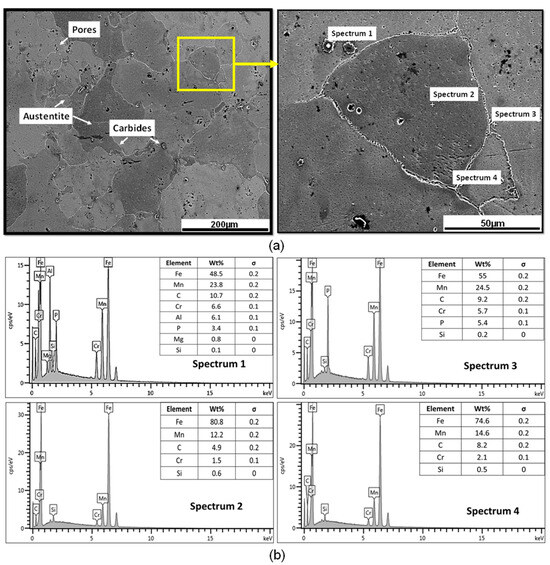 (a) Microstructural behavior and (b) EDS analysis of the austenite phase and carbides present in the grain boundaries of the material in the as-cast state.