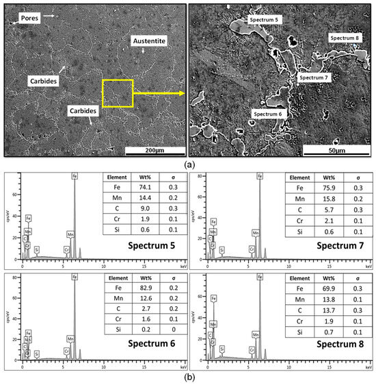 Figure 3 shows the specimen in the annealed state exhibiting equiaxial austenitic grains and a higher proportion of precipitated carbides at the grain boundaries compared to the material in the as-cast state. This is consistent with the thermal cycle applied. No evidence of any process induced by steel decarburization is observed. Analyzing the EDS spectra, the presence of complex carbides of the type (Fe, Mn)3C and (Fe, Mn)7C3 is noted due to the high weight percentage concentration of Mn and C reported. This behavior was documented by Torabi et al. [11], who reported (Fe, Mn)3C-type carbides in their EDS analysis with weight percentages of Mn = 15.07, Fe = 74.29, and C = 5.07.