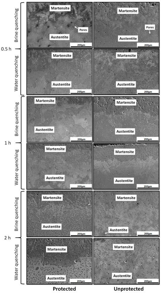 Figure 4 summarizes the microstructural behavior of water- and brine-quenched specimens after exposure at austenitizing temperature (1080 °C) for 0.5 h, 1 h, and 2 h with and without decarburization protection.