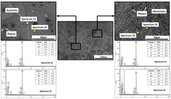 Figure 5 shows the microstructural behavior of the specimen in the protected condition with a smaller wear rate (0.2355 g/min) and volumetric loss (151 mm3) after the material in the as-cast state. An essentially austenitic behavior is observed in the entire mass of the specimen. However, there is a 40 µm layer of Martensite induced by decarburization, which indicate that the sand protection used in this study was not completely efficient. When comparing the EDS spectrum number 2 of the material in the as-cast state with spectrum 12 of the specimen in the brine quenching condition, an increase of 1.4% in manganese, 2.6% in carbon, and 0.3% in chromium was observed, which could be an indication of the movement of the C-Mn pair in the direction of decarburization. The increased presence of Cr helped to prevent a disproportionate loss of carbon and manganese, and therefore prevented the formation of more Martensite. At depths greater than 40 µm, a completely austenitic behavior is observed with the presence, according to the EDS spectra, of some carbides of the (Fe, Mn)3C and (Fe, Mn)7C3 type. The formation of a heterogeneous microstructure across the sample thickness is supported by these observations. According to recent studies, heterostructured metallic materials are a novel category of materials that have the potential to disrupt established paradigms, including the incompatibility between strength and ductility [27,28].