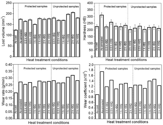 Figure 9 shows the behavior of the worn surfaces for the different thermal cycles under study. The results in Figure 8 are consistent with the results shown on the worn surface in Figure 9. The samples in the as-cast condition, and the austenitized one in the protected condition for 1 h and quenched in brine, showed good wear behavior with the presence of uniform plowing in all the mass of the specimen. In the rest of the samples, the presence of combined wear mechanisms such as micro cracks, fractured ridges, wedges, and material removal is noted. As for the material in the annealed state, the presence of several wear mechanisms is observed, evidencing the presence of second-phase compounds that brittle the microstructure, generating a greater loss of material with the presence of areas with fractured ridges and wedges due to its higher surface hardness (312 HB). The volumetric loss was 175 mm3, with a wear rate of 0.2716 g/min. The worst wear behavior was observed in the specimens that were austenitized without protection against decarburization and held for 2 h, independent of the quenching medium (see Figure 8). An increase of 66.8% in the wear rate was observed for the specimens austenitized for 2 h and quenched in brine compared to the material in the as-cast state with a wear rate of 0.3202 g/min, as well as an increase of 59.76% in the wear rate for the specimen austenitized for 1 h and quenched in water with a wear rate of 0.308 g/min. The wear mechanisms observed were material removal, presence of wedges, micro cracks, and plowing.