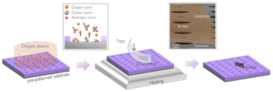 The underlying mechanism is as follows. Pre-patterned substrates with microcavities invariably accumulate organic contaminations during micro/nanofabrication and subsequent storage [97,98]. Ultraviolet light produced in the plasma is highly effective in breaking down most organic bonds present in surface contaminants. This process aids in the breakdown of organic contaminations. At the same time, these organic compounds undergo vigorous oxidative chemical reactions when exposed to energetic oxygen species created in the plasma, as shown in Figure 1. Specifically, oxygen molecules undergo collision, dissociation, ionization, and recombination effects under the influence of high-speed electrons and the photoelectric effect, thereby generating oxygen plasma. Oxygen plasma comprises various particles, including , and excited-state energetic oxygen species such as , among others. Notably, excited oxygen species can react with the organic layer on the substrate surface, resulting in the following chemical reactions: [99], leading to the spontaneous pressurization of the atomic sheet that seals these molecules into the cavity.