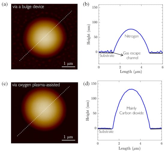 Atomic force microscopy (AFM, Brucker Multimode 8) was employed to characterize the morphology of bubbles. The scanning was conducted in tapping mode with a scanning frequency of 0.7 Hz. An AFM cantilever featuring a silicon tip, with a resonance frequency of 150 kHz and a stiffness of 2.8 N/m, was utilized for the measurements. Figure 2a illustrates the height of bubbles fabricated via the oxygen plasma-assisted method, with a bubble height of about 130 nm. A comparative analysis with bubbles prepared using a bulge device revealed a conspicuous distinction. Particularly, bubbles prepared using a bulge device (similar to that in [85]) exhibited numerous minuscule bubbles at the graphene/substrate interface, as shown in Figure 2a,b. In contrast, these minuscule bubbles were absent in bubbles prepared using the oxygen plasma-assisted method. This difference confirmed the essential difference in the principles of the two bubbling methods. When using a bulge device, gas molecules are required to diffuse into the circular cavity through the channel between the material and the substrate. This diffusion causes gas molecules to accumulate at the interface, especially in the local contaminated areas, forming many nanobubbles and reducing interfacial adhesion. Furthermore, these smaller nanobubbles act as pathways for further gas diffusion, compromising the stability during the decay stage of the bubble. Conversely, the method proposed in this study effectively addresses this issue through directly generating gas from within the cavity, as shown in Figure 2d. Good interfacial integration should be able to slow down the escape of gas molecules. In addition, since bubble formation occurs through a rapid reaction, the preparation time of 2D materials bubbles is significantly reduced from over 4–6 days [13,35] to a few minutes. Therefore, this preparation method is high-throughput, with the number and size well controlled through the pre-patterning of the substrate, which can even be rectangular or other irregular shapes [37].
