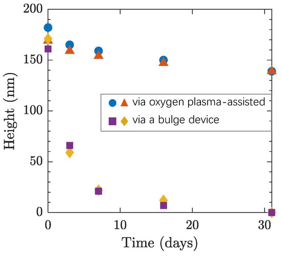 Height measurements of 3-layer thickness bubbles measured over 31 days. All bubbles showed signs of gradual deflation, indicating that the gas of the bubbles was able to escape through the graphene/SiO2 interface but at a much slower rate in bubbles prepared via the oxygen plasma-assisted method than the direct bulging method. For the same bubble, the height was measured along three different line scanning directions, and the error was found within 1 nm.
